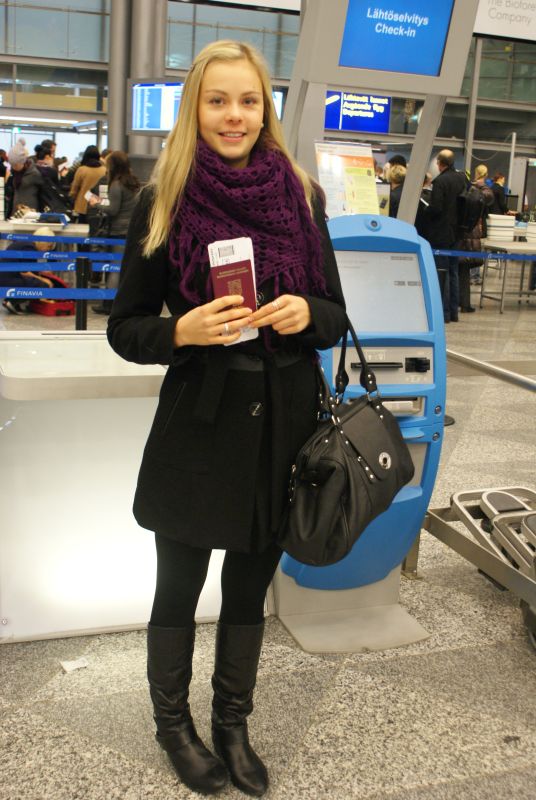 Lähdimme taksilla lentokentälle puoli viiden aikoihin aamuyöstä (tai no minulle se on jo aamua). Tärkeimmät, eli passi ja hammasharja, oli pakattu jo edellisenä iltana mukaan. Otin pari asukokonaisuutta mukaan siltä varalta, jos onnistun sotkemaan itseni – kamera ja päiväkirja tietysti myös laukussa. Lentokentällä olin suoraan sanottuna paniikissa, kun tuli aika nousta koneeseen. Kapusin kuitenkin urheasti lentsikkaan uhmaten kuolemanpelkoa, olenhan ritarin tytär (äitini sai ritarimerkin tänä itsenäisyyspäivänä)! 😀