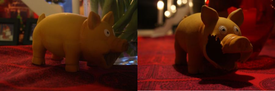 Vili sai nakkien lisäksi lahjaksi Mustista ja Mirristä ostetun ”joulupossun”, joka röhki, kun sitä puristi. Ajatuksena lahja oli tietysti kiva, mutta eihän se tuon nastahampaan käsittelyssä kestänyt ehjänä kuin hetken 😀 Noh, enää ei possu röhki, mutta ainakin oli mieluisa lahja, kun hauva touhusi koko aattoillan lahjansa kimpussa hah!