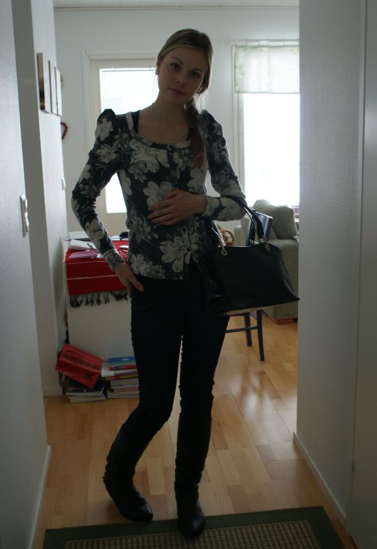 En ihan hirveesti jaksanut panostaa ulkoiseen olemukseen, mutta valkkasin päälle silti uudet farkkuni, joista taisin mainita jo aiemmin. Ihan älyttömän hyvät jalassa, ei purista vyötäröltä sisäelimiä ruttuun. Merkki on muuten Object (Vero Moda). Ehkä totuttelen taas pikku hiljaa käyttämään farkkuja, saa nähdä… Korkkasin myös joululahjaksi saamani italialaisen kiiltonahkalaukun ja täytyy sanoa, että rakastan sitä päivä päivältä enemmän<3