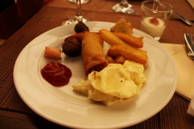 No minä olin tietenkin ihan onnessani lihapullista, ranskiksista, kalapuikoista ja kermaperunoista sillä aikaa, kun äiti ja Santtu maistelivat sivistyneemmin mätitahnoja ja katkiksia:D Oma kulinaarinen kohokohtani löytyi kyllä lasten buffetin puolelta: ranskalaiset ja ketsuppi maistuivat monen monen vuoden jälkeen sanoinkuvaamattoman ihanilta:) Unohtamatta jälkiruokapöydän pannukakkua, jonka kruunasin kinuskikastikkeella. Yksinkertainen on parasta.
