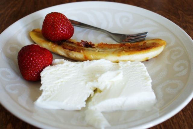 Herq! Paistettua banaania vaniljajäätelön ja mansikoiden kera.
