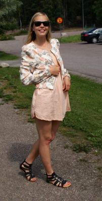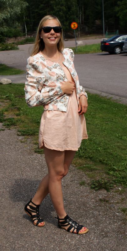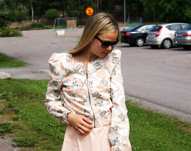 Tämän postauksen alkuperäinen idea taisi olla kuitenkin muutamien löytöjen esittely. En ole ikinä viihtynyt kovin hyvin alennusmyynneissä. Haluan tehdä ostokseni siististi ja rauhassa, en kyynärpäätaktiikalla ja ryttyisiä vaatekasoja kaivellen. Tänä kesänä kuitenkin ihan sattumalta löysin pari kivaa alennettua vaatekappaletta siististi henkarissa roikkuen lähes autiosta vaatekaupasta. Yksi näistä on kukkakuosinen, lyhyt ja vetoketjullinen pikkutakki, jonka voi kesäillan viiletessä heittää niskaan lämmikkeeksi. Normihinta huiteli neljässäkympissä, mutta minäpä maksoin siitä alle 15e! Ja kuinka elinamainen se onkaan! Kävelin jo ulos Veromodasta ilman takkia, mutta autolle päästyäni käännyin ympäri ja kävin nappaamassa sen mukaani – olisi ollut väärin jättää se odottamaan jotakuta toista!