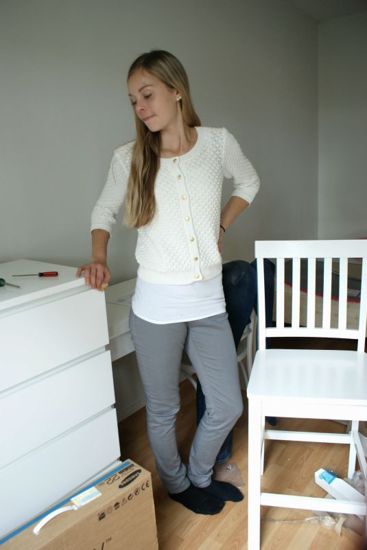 Päivällä oltiin Santun kanssa kasaamassa viimeisiä huonekaluja ja vähän muutenkin järjestelemässä paikkoja asunnolla. Kun oltiin saatu ruokapöytä ja tuolit ruuvailtua, lähdettiin kauppaan hakemaan syötävää: kriiteereinä helppo valmistus (eli valmisruokaa) ja herkullisuus. Päädyttiin valmislasagneihin ja pillimehuihin (no Santtu otti rakennuskaljaa). Kylkeen ostettiin vielä naposteluporkkanoita ja jälkkäriksi minisuklaapatukat ja lakupötköt. Oli ihanaa ensimmäistä kertaa ”valmistaa” ruokaa omassa kodissa ja nauttia se oman ruokapöydän ääressä<3 Masut täynnä ja mieli taas vähän levänneenä jaksettiin vielä kiinnittää vaaleanpunainen kattokruununi eteiseen, jeejee.