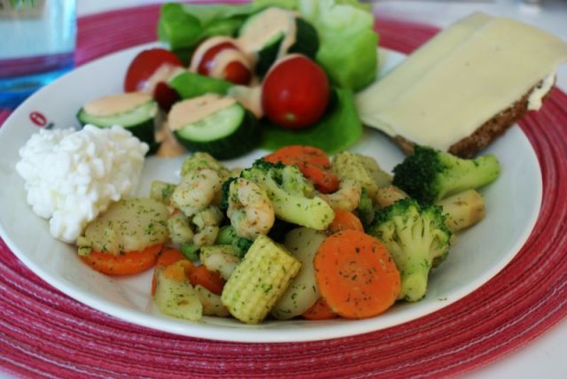 Pussin pakastevokkivihanneksia tai vokkivihanneksia itse pilkottuna (minimaissi, porkkana, kesäkurpitsa, lanttu, paprika, mitä ikinä keksitkään) sekä pakastealtaasta pussin tilli-sitruunakatkarapuja. Mausteita voi lisäillä oman maun mukaan. Itse tosin tulin tulokseen, että marinoidut katkaravut tuovat itsessään jo ihan tarpeeksi makua ja mehevyyttä, joten lisäkastikkeita tai muitakaan mausteita en käyttänyt.