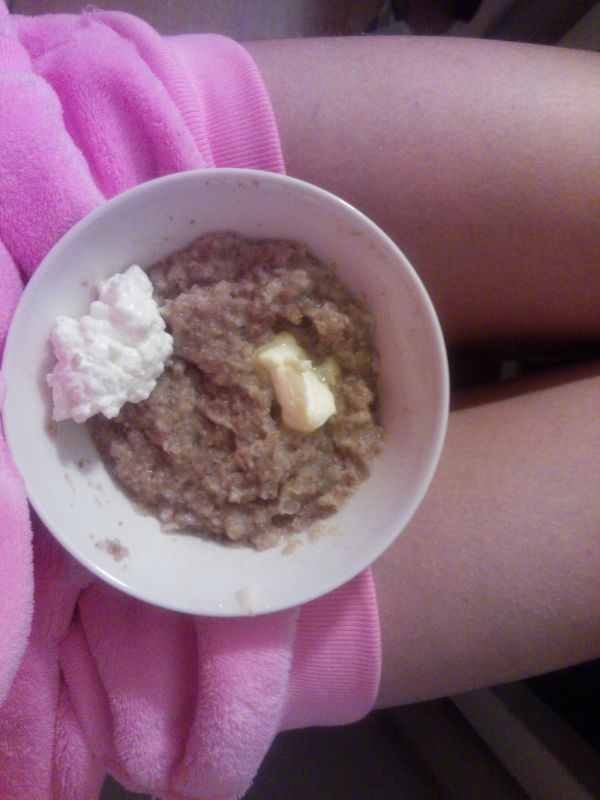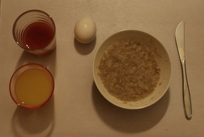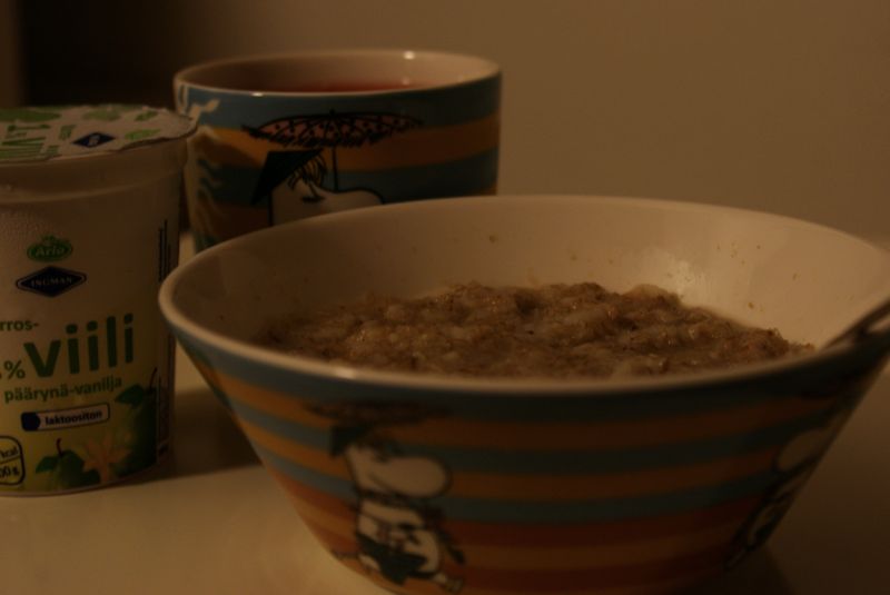 Luulin todella pitkään, ettei minun tee aamulla mieli muuta kuin juustoruisleipiä ja jugurttia. Vaihtoehtoisesti joskus viiliä hillolla. Eräs aamu tässä repäisin ja mikrotin puurolautasellisen. Söin sen ripauksella suolaa margariinisilmän kanssa. Ai että. Sittemmin olen syönyt puuron lisäksi joko sitä jugurttia tai keittänyt kananmunan kaveriksi. Juomaksi juon aina lasillisen mehukeittoa. Kahvia sitten koko aterian päätteeksi. Tuli jälleen todettua, että vaihtelu tosiaan virkistää, kaavoihin kangistuminen ei kannata, heh.