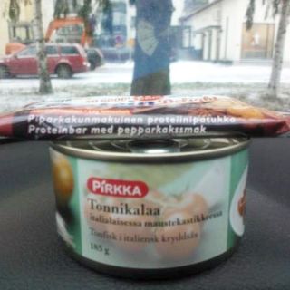 Aina en tietenkään ole kotona ruoka-aikaan. Työpäivinä syön toisen kunnollisen ruoan töissä – niin kunnollisen kuin eväistä vaan on mahdollista koostaa ja syödä kaiken kiireen keskellä. Kunnon proteiinipläjäys ja lähiaikoina luottoevääni: tonnikalapurkki ja proteiinipatukka. Lisänä riisikakkuja, jos olen tullut aamuvuoroon. Okei, tonnari alkaa kohta puskemaan korvista ulos. Sitä odotellessa jatkan samalla linjalla:D