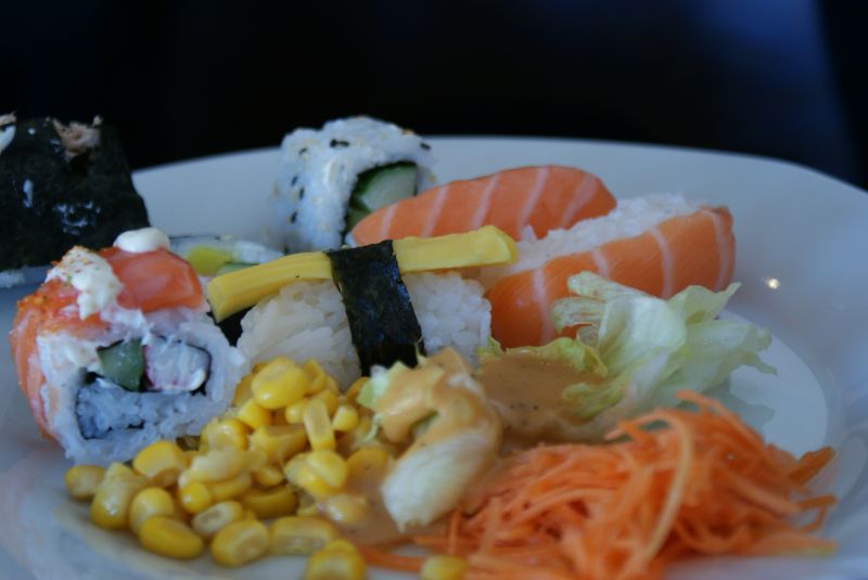 Ilokseni huomasin, että toinen mahdollisuus sushille kannatti. Huomasin oikeasti pitäväni nigireistä (vai mitä ovatkaan nuo, joissa on vain lohta päällä). Merilevän mausta en vieläkään pidä, mutta nyrpin kääreen ympäriltä pois, heh. Tosin täytyy sanoa, että ei friteerattuja kanapaloja ja riisiä hapanimeläkastikkeella voita mikään.