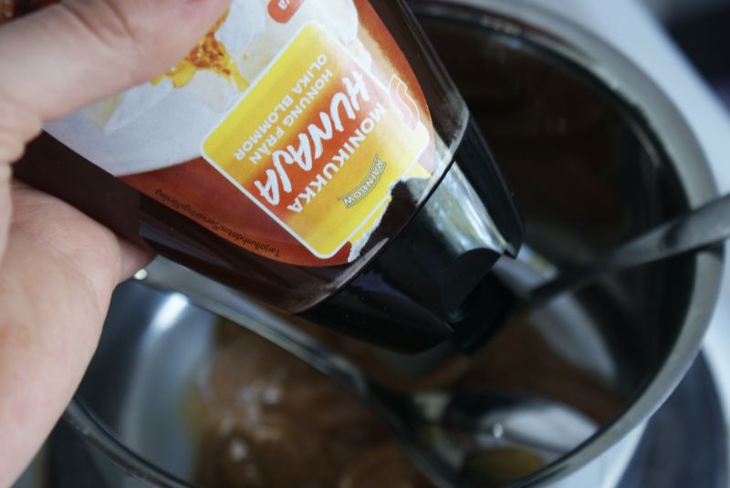 Ensin tulee sekoittaa maapähkinävoi ja hunaja kattilassa hyvin sekaisin. Kattila liedelle ja miedolla lämmöllä hämmennystä. Tämä oli patukoiden valmistuksen ehkä vaativin osuus. Eli patukkaohje ei vaativaa ole nähnytkään. Tosin meinasin itse kämmätä koko valmistuksen heti alkuun unohtamalla kattilan liedelle vailla sekoittelua.