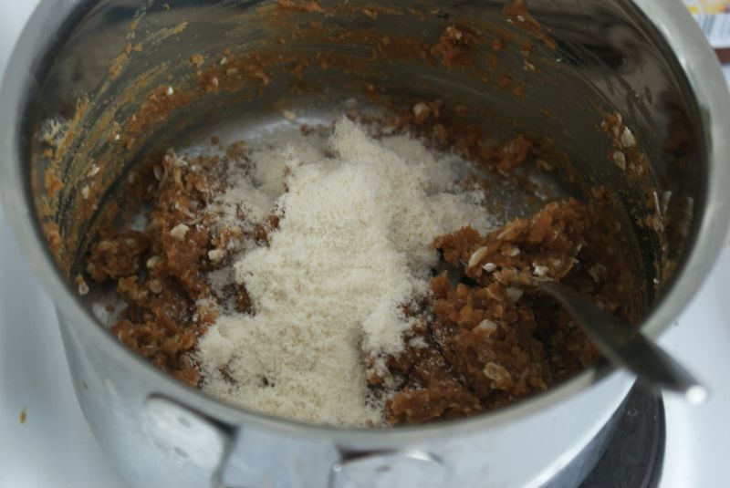 Seuraavaksi sekaan voi heittää kaurahiutaleet ja omat sormet. Minulla ainakin meni tässä vaiheessa hermo lusikoihin ja niihin tarttuviin klöntteihin, joten suosiolla jatkoin vaivaamista käsin. Tässä välissä lisäsin vielä pari lusikallista vettä, sillä mössö vaikutti epäilyttävän kuivalta.