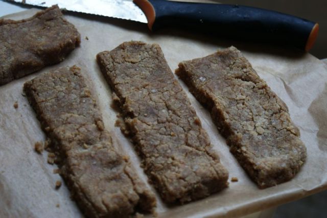 Lopuksi sekoitetaan vielä proteiinijauheet mukaan. Kannattaa ehkä vaivate ne joukkoon muutamassa osassa, huomattavasti kätevämpää. Valmis protskupatukkataikina nostetaan leivinpaperille ja muotoillaan siitä suorakaiteenmuotoinen lätty. Itse leikkasin taikinan viideksi patukaksi. Ennen leikkuuta laitoin taikinalätyn hetkeksi pakastimeen ehkäisemään murenemista. Omastani tuli nimittäin ehkä hiukan liian kaurahiutalekyllästetty. 😀