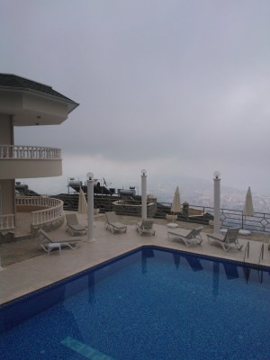 Meidän villa, Snow Drop, sijaitsee korkealla vuorella, Bektas-nimisellä alueella. Alhaalla paahtaa näin aamulla yhdeksän aikaan jo aurinko, mutta tänään me täällä ylhäällä olemme todellakin aivan pilvessä, osittain jopa pilvien yläpuolella. Joimme juuri aamukahvit terassilla ja seurasimme, kuinka pilviharsot leijailivat aivan nenämme edessä. Jännä tunne! Nyt ilma alkaa jo selkenemään ja alhaalla heräilevä kaupunki näkymään pilviharsojen lomasta.