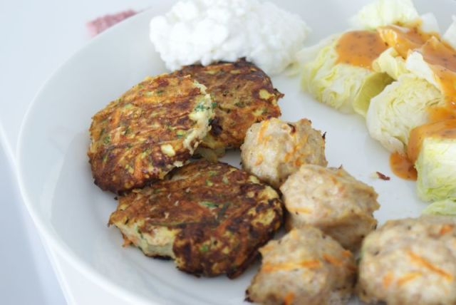 Itsetehtyjä kasvispihvejä ja broileripyöryköitä.