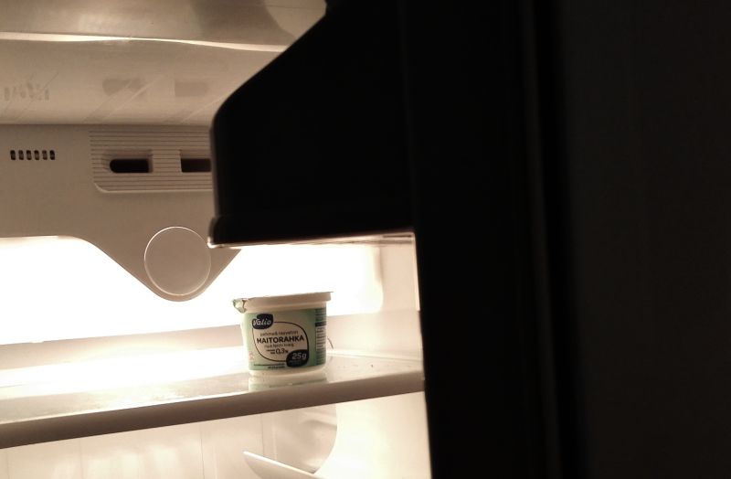 Sittenhän se iski. Sängyssä ehdittyäni jo torkahtaa. Siis se sellainen tunne – varmaan vähän samantyyppinen kuin äidinvaisto: nyt eivät asiat ole reilassa. Jääkaapillahan tilanne laukesi yhteen ainokaiseen lausahdukseen: liian kostea. Molemmat yritykset ulkonäöllisesti tarjoilukelvottomia. Siten taisin asian ilmaista sen kaiken kyynelehtimisen keskellä. Voi kolme desiä ja kanaliemi sentään!